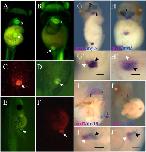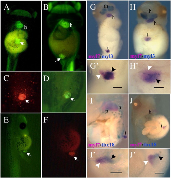 Fig. 3. Ventricular and proepicardial gene expression is restored in reaggregated animal cap explants expressing GATA4 upon transplantation into host embryos. (AâF) Dissociated and reaggregated GATA4 injected explants (CAG-GFP) were transplanted at stage 20 into host (CAG-GFP) at the same stage. GFP expression was recorded at stage 39. (C, F) lineage tracing (rhodamine dextran) of transplants in D and E. (G, H) Transplants were analysed for the expression of myl7 and myl3. 48% of transplants (n = 45) showed patterned gene expression with regions of overlapping expression between myl7 and myl3 corresponding to the ventricle and regions expressing myl7 alone. 30% of transplants expressed only myl7, and in 17% there was a complete overlap between myl7 and myl3. (Gâ², Hâ²) Close-up of transplants shown in G and H. Black head arrow shows overlapping gene expression and white head arrow shows region of myl7 expression alone. (I, J) 65% of transplants (n = 30) express both Tbx18 and myl7. (Iâ²,Jâ²) Close-up of transplants shown in I and J. h, heart; ih, interhyoid muscle of the jaw; p, proepicardium; v, ventricle. The scale bar corresponds to 100 μm. |
