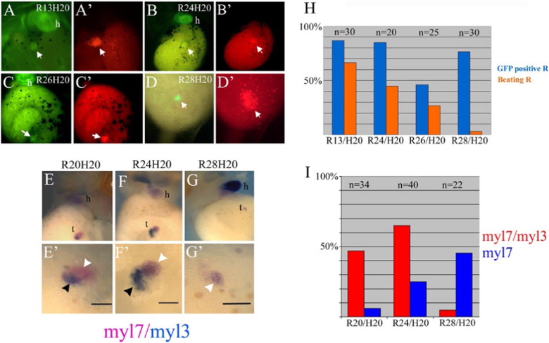 Fig. 7. Competence to generate a secondary heart is maintained until the onset of cardiac differentiation. GATA4-injected animal cap reaggregates (CAG-GFP) were transplanted at stage 13 (A, Aâ²), 24 (B, Bâ²), 26 (C, Câ²) and 28 (D, Dâ²) in the ventral side of host embryos at stage 20 (CAG-GFP) and were analysed at stage 39â40 for cardiac GFP expression and for lineage tracing (rhodamine-dextran). (EâGâ²) Patterned expression of myl7 and myl3 was found in reaggregates transplanted at stage 20 and 24. Overlapping expression is indicated by black arrowheads and myl7-only expression by white arrowheads. (H) Summary of frequency of GFP expression and beating activity. The capacity to generate a beating structure declines with the increasing age of the transplants. (I) Data summarised the number of embryos positive to the gene expression of myl7 and myl3 in double WMISH. h, heart; t, transplant. The scale bar corresponds to 100 μm. |