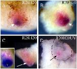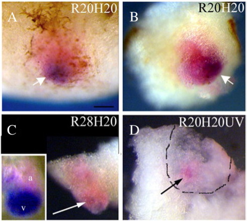 Fig. 8. Growth of secondary hearts is dependent on the host embryo. Transplants in samples analysed by double-WMISH for myl7 and myl3 at stage 39 were visualised by lineage tracing (pink-light red colour). (A, B) Examples of control transplants (R20H20; GATA-4 injected reaggregates transplanted at stage 20 into host embryos at the same stage) show that cardiac tissue occupies a substantial part of the transplant. In contrast, cardiac tissue in (C) R28H20 and (D) R20H20UV (UV-ventralised hosts) transplants occupies a much smaller area (arrows). (D) Inside view of a dissected sample is presented to better show cardiac tissue (myl7, pointed by an arrow). Lineage trace that is visible from the outside is outlined. The scale bar corresponds to 100 μm. All images except the insert in (C) (showing the heart dissected from control embryo at stage 39) are at the same magnification. At least 5 samples were analysed for each treatment, with comparable results. |