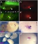 Fig. 6. Dorsal GATA4-expressing transplants show a Dkk-1 sensitive delay of cardiogenesis. (A, Aâ²) Control transplants of GATA4-injected reaggregates (CAG-GFP) showed cardiac differentiation by GFP expression at stage 37 as indicated by the arrows. (B, Bâ²) In contrast, transplants placed in the dorsal side of the host (position 6 in Fig. 5A) were negative for GFP expression at stage 37 (100%; n = 20), but 50% were positive after stage 39 (C, Câ²). No beating activity was detected in these reaggregates. (D, Dâ²) Double-WMISH showed that 20% (n = 94) of dorsal transplants express myl7 alone (white arrowhead) and only a small group of cells express both myl7 and myl3 (black arrowhead). (EâFâ²) Both control and dorsal transplants of reaggregates (CAG-GFP) co-injected with GATA4 and Dkk-1 showed evidence of cardiac differentiation (GFP activity) at stage 37. (G, Gâ²) Cardiac expression is maintained in dorsal transplants at stage 40. Beating activity was never detected in dorsal transplants. (H, Hâ²) Double WMISH shows overlapping expression between myl7 and myl3 (black arrowhead) and regions of myl7 expression alone (white arrowhead) in 35% of dorsal transplants (n = 84; the remaining transplants were negative for cardiac gene expression). a, atrium; ih, interhyoid muscle of the jaw; t, transplant; v, ventricle. The scale bar corresponds to 100 μm. |