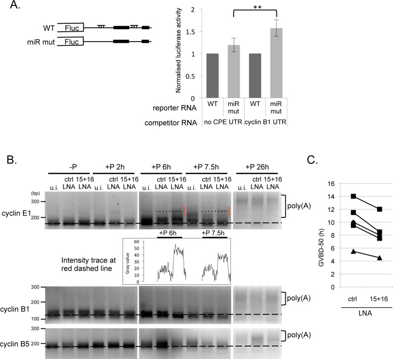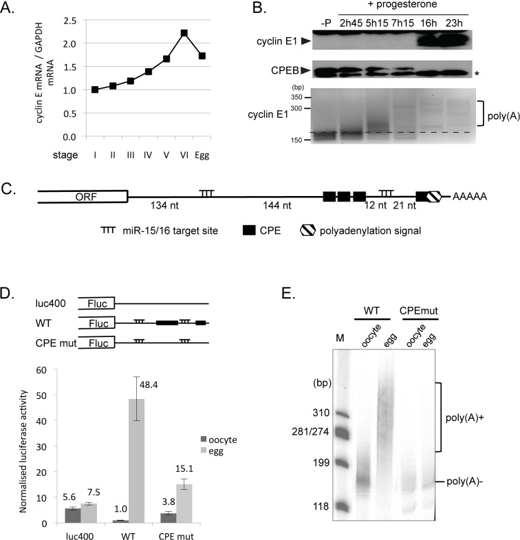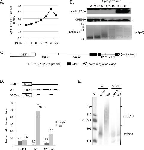 Cell cycle transitions spanning meiotic maturation of the Xenopus oocyte and early embryogenesis are tightly regulated at the level of stored inactive maternal mRNA. We investigated here the translational control of cyclin E1, required for metaphase II arrest of the unfertilised egg and the initiation of S phase in the early embryo. We show that the cyclin E1 mRNA is regulated by both cytoplasmic polyadenylation elements (CPEs) and two miR-15/16 target sites within its 3'UTR. Moreover, we provide evidence that maternal miR-15/16 microRNAs co-immunoprecipitate with CPE-binding protein (CPEB), and that CPEB interacts with the RISC component Ago2. Experiments using competitor RNA and mutated cyclin E1 3'UTRs suggest cooperation of the regulatory elements to sustain repression of the cyclin E1 mRNA during early stages of maturation when CPEB becomes limiting and cytoplasmic polyadenylation of repressed mRNAs begins. Importantly, injection of anti-miR-15/16 LNA results in the early polyadenylation of endogenous cyclin E1 mRNA during meiotic maturation, and an acceleration of GVBD, altogether strongly suggesting that the proximal CPEB and miRNP complexes act to mutually stabilise each other. We conclude that miR-15/16 and CPEB co-regulate cyclin E1 mRNA. This is the first demonstration of the co-operation of these two pathways.