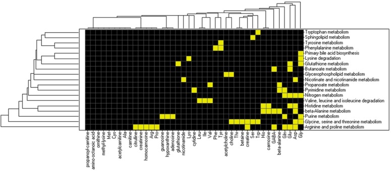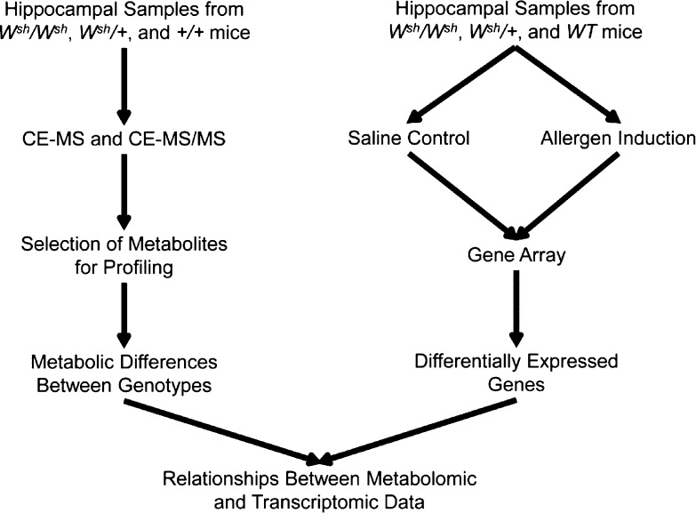 The integration of disparate data types provides a more complete picture of complex biological systems. Here we combine small-volume metabolomic and transcriptomic platforms to determine subtle chemical changes and to link metabolites and genes to biochemical pathways. Capillary electrophoresis-mass spectrometry (CE-MS) and whole-genome gene expression arrays, aided by integrative pathway analysis, were utilized to survey metabolomic/transcriptomic hippocampal neurochemistry. We measured changes in individual hippocampi from the mast cell mutant mouse strain, C57BL/6 Kit(W-sh/W-sh). These mice have a naturally occurring mutation in the white spotting locus that causes reduced c-Kit receptor expression and an inability of mast cells to differentiate from their hematopoietic progenitors. Compared with their littermates, the mast cell-deficient mice have profound deficits in spatial learning, memory, and neurogenesis. A total of 18 distinct metabolites were identified in the hippocampus that discriminated between the C57BL/6 Kit(W-sh/W-sh) and control mice. The combined analysis of metabolite and gene expression changes revealed a number of altered pathways. Importantly, results from both platforms indicated that multiple pathways are impacted, including amino acid metabolism, increasing the confidence in each approach. Because the CE-MS and expression profiling are both amenable to small-volume analysis, this integrated analysis is applicable to a range of volume-limited biological systems.