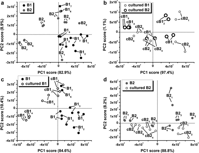 cell culture. Respective loading plots are shown in Figure S2. Metabolic differences were (c) clear between the