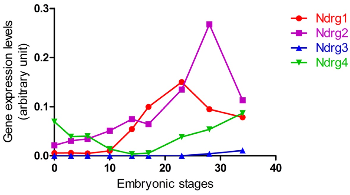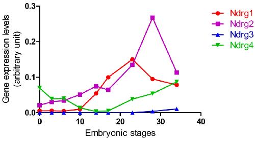 Fig. 3. The temporal expression patterns of Ndrg1, 2, 3 and 4 during Xenopus tropicalis embryogenesis. qRT-PCR analysis of relative expression levels of Ndrg1, 2, 3 and 4 at eggs (stage 0), cleavage stage (stage 3 and 6), gastrula stage (stage 10), neurula stage (stage 14 and 17), early tailbud stage (stage 23 and 28) and late tailbud stage (stage 34). |