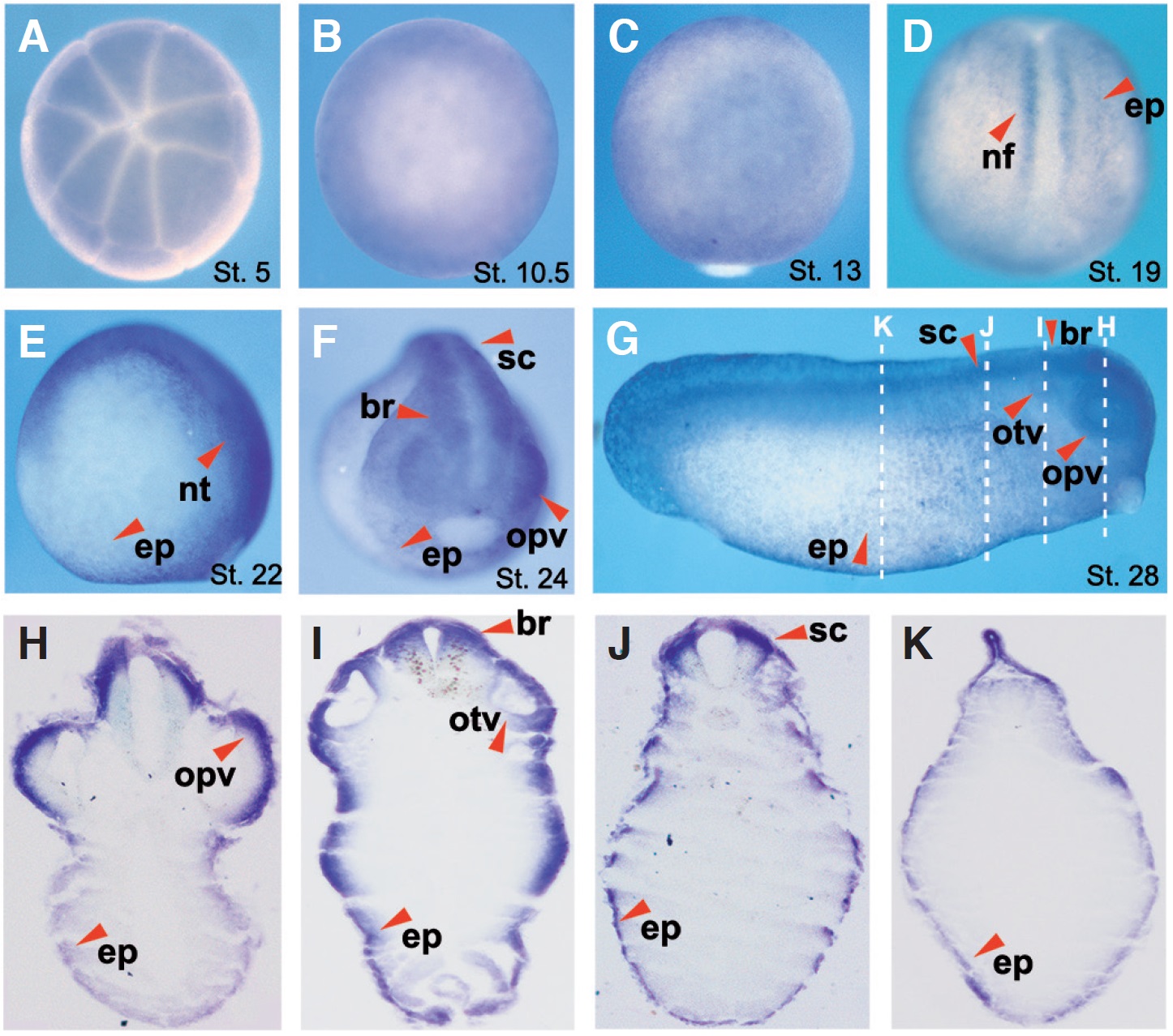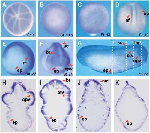 Fig.5. The spatial expression pattern of Ndrg2 during Xenopus tropicalis embryogenesis. (A,B) Animal view. (C,D) Dorsal view, anterior to the top. (E,G) Lateral view, dorsal to the top and anterior to the right. (F) Anterior view, dorsal to the top. (H-K) Transverse paraffin sections of stage 28 embryos after WISH. Abbreviations: br (brain), ep (epidermis), nf (neural fold), nt (neural tube), opv (optic vesicle), otv (otic vesicle), sc (spinal cord). |