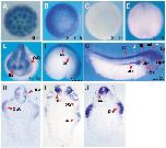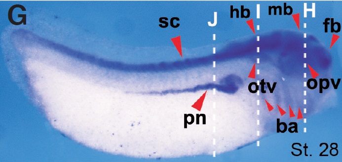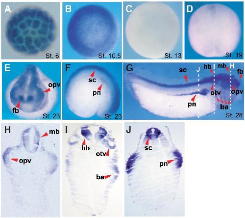 Fig. 7 (Right). The spatial expression pattern of Ndrg4 during Xenopus tropicalis embryogenesis. (A,B) Animal view. (C,D) Dorsal view, anterior to the top. (E) Anterior view, dorsal to the top. (F, G) Lateral view, dorsal to the top and anterior to the right. (H-J) Transverse paraffin sections of stage 28 embryos after WISH. Abbreviations: ba (branchial arch), fb (forebrain), mb(midbrain), hb (hindbrain), opv (optic vesicle), otv (otic vesicle), sc (spinal cord), pn (pronephros). |