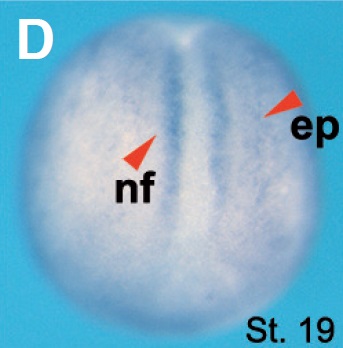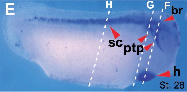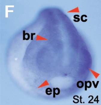 Fig. 6 (Left). The spatial expression pattern of Ndrg3 during Xenopus tropicalis embryogenesis. (A,B) Animal view. (C,E) Lateral view, dorsal to the top and anterior to the right. (D) Anterior view, dorsal to the top. (F-H) Transverse paraffin sections of stage 28 embryos after WISH. Abbreviations: br (brain), h (heart), ptp (profundal and trigeminal placodes/ganglia), otv (otic vesicle), sc (spinal cord). |
