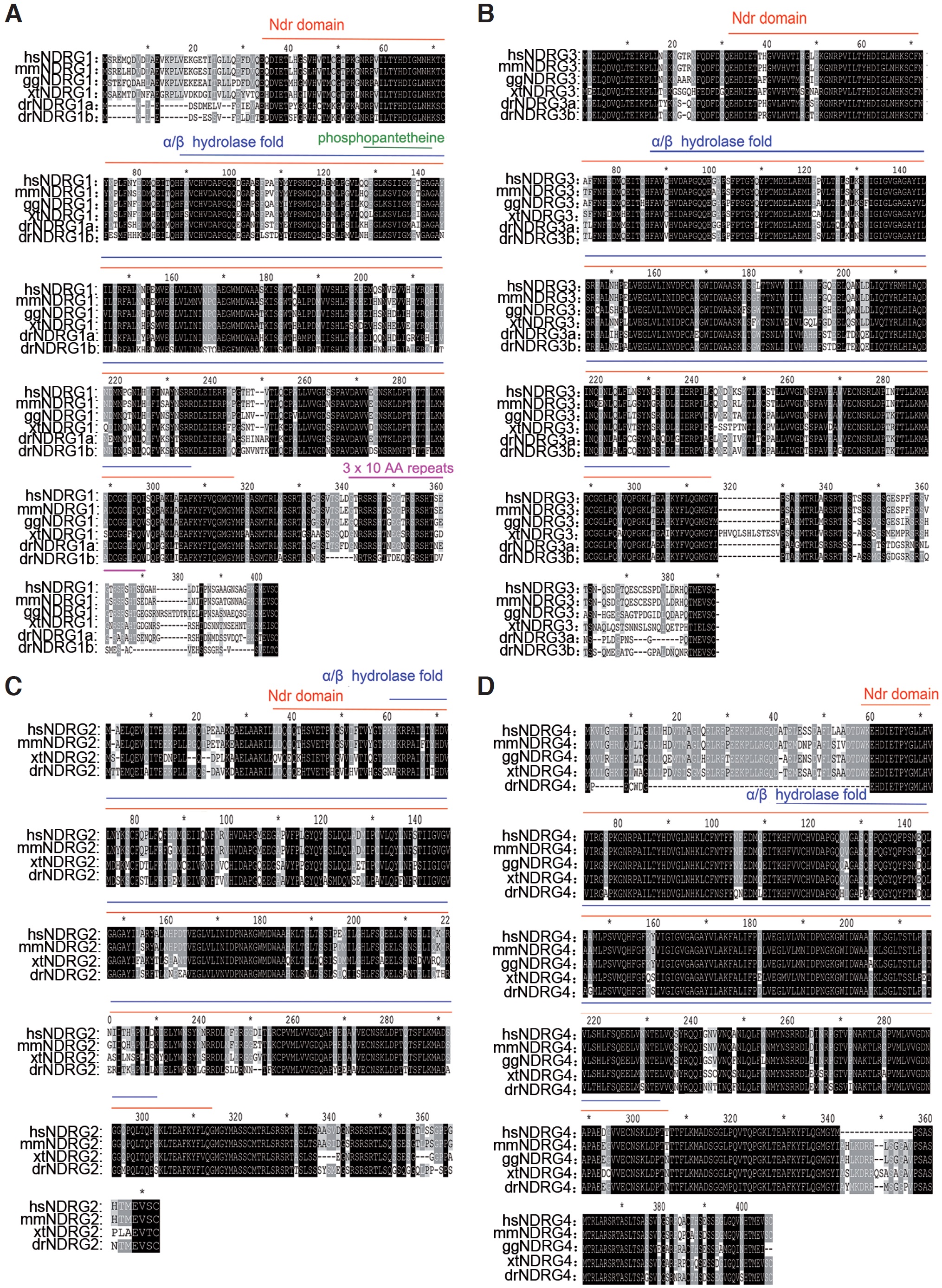 Fig. 1. Amino acid sequences alignment of the Ndrg genes. (A-D) Amino acid sequences of Ndrg1, 2, 3, and 4 from different vertebrates were aligned respectively. Amino acid sequences were collected from human (Homo sapiens), mouse (Mus musculus), chicken (Gallus gallus), frog (Xenopus tropicalis), and zebrafish (Danio rerio). Identity residues from zebrafish to mammals are shown in black, and similarity sites are shown in gray. The red, blue, green and pink lines indicate Ndr domain, a/b hydrolase-fold motif, phosphopantetheine site and 3×10 AA (GTRSRSHTSE) tandem repeats, respectively. Abbreviations: hs (Homo sapiens), mm (Mus musculus), gg, (Gallus gallus), xt (Xenopus tropicalis), dr (Danio rerio). |