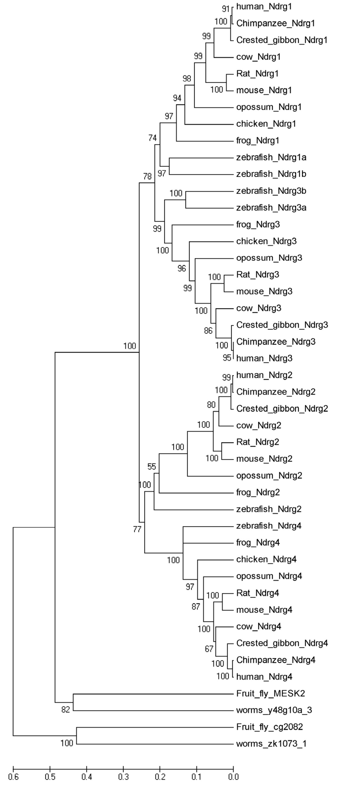Fig. 2. Phylogenetic tree of the Ndrg genes. The CDSs of the Ndrg genes were obtained from human (Homo sapiens), chimpanzee (Pan troglodytes), gibbion (Nomascus leucogenys), cow (Bos taurus), rat (Rattus norvegicus), mouse (Mus musculus), opossum (Monodelphis domestica), chicken (Gallus gallus), frog (Xenopus tropicalis), zebrafish (Danio rerio), fruit fly (Drosophila melanogaster), and worm (Caenorhabditis elegans). NJ based phylogenetic tree was constructed by MEGA5 software. Numbers on branch nodes are bootstrap replication values. The scale bar represents the number of amino acids substitutions. |