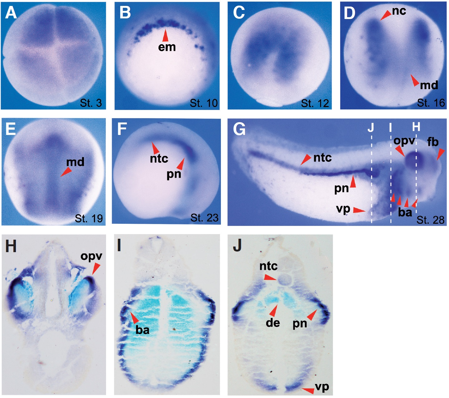 Fig. 4. The spatial expression pattern of Ndrg1 during Xenopus tropicalis embryogenesis. (A) Animal view. (B) Vegetal view, dorsal to the top. (C) Dorsal view, vegetal to the bottom. (D, E) Dorsal view, anterior to the top. (F, G) Lateral view, dorsal to the top and anterior to the right. (H-J) Transverse paraffin sections of stage 28 embryos after WISH. Abbreviations: ba (branchial arch), de (dorsal endoderm), fb (forebrain), em (endomesoderm), nc (neural crest), md (midline), ntc(notochord), opv (optic vesicle), pn (pronephros), vp (ventral pancreatic bud). |