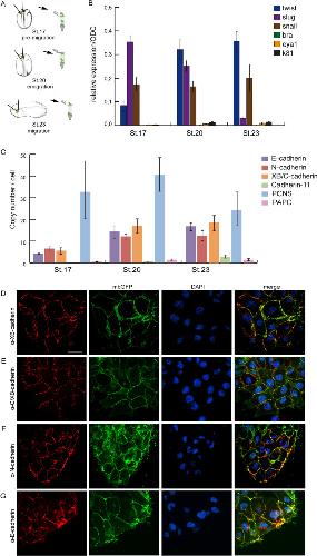 Fig. 1. Expression profile of different cadherin subtypes in Xenopus cranial neural crest (CNC) cells. (A) cDNAs for real-time PCR quantification were synthesized using RNAs extracted from Xenopus CNC explants at stage 17, 20 and 23, respectively. (B) The identities of sample tissues were validated via RT-qPCR amplification with different tissue markers. CNC markers twist, slug and snail were present in high abundance in CNC samples throughout all three assayed stages. The mesodermal marker bra, the placodal marker eya1 and the epithelial marker k81 were barely detectable in all CNC samples. All values were normalized and calibrated to the expression of the reference gene ornithine decarboxylase (ODC) (expression of ODC=1). (C) Copy number (per cell) of E-, N-, XB/C-cadherin, Cadherin-11, PCNS and PAPC in CNC during migration. Copy number of each cadherin was calculated by absolute quantification using standard curves. At least three independent quantifications were performed and the bars indicate average values with standard deviations. Immunofluorescence staining of endogenous XB-cadherin (D), C/XB-cadherin (E), N-cadherin (F) and E-cadherin (G) on CNC explants. CNC cells were labelled with membrane GFP and explanted on a fibronectin-coated surface at stage 17. DAPI staining was used to visualize cell nuclei. All cadherins are prominently localized at cellâcell contacts. Scale bar: 10 μm.