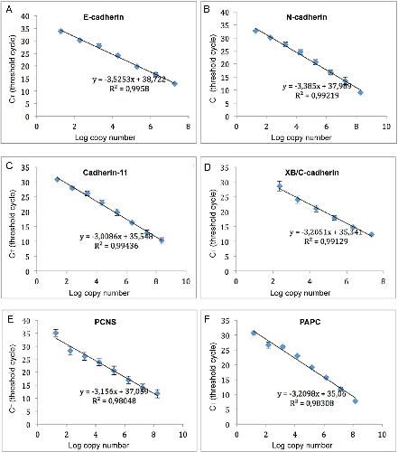 Standard curves for (A) E-cadherin, (B) N-cadherin, (C) Cadherin-11, (D) XB/C-cadherin, (E) PCNS and (F) PAPC, respectively. The standard curves were calculated with serial 10-fold dilutions of the plasmid DNA, ranging from 10 to 1 à 108 copies/μl. Each standard dilution was amplified by RT-qPCR using validated primers in triplicates. For each gene, the determined CT values were plotted against the logarithm of their calculated initial copy numbers. Independent serial dilutions of the standards were repeated at least three times for each dilution and the mean value with standard deviation is shown. A standard curve was generated by linear regression through the points representing the mean values. The equation for the regression line and the correlation coefficient (R2) are shown above the graph. The equation was used to determine the starting quantity of the test sample from the experimental CT values.