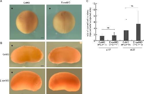 Embryos were injected with either 8 ng CoMO or 8 ng E-cadMO at 16-cell stage and fixed at stage 17 or stage 23, followed by whole mount TUNEL assay. Apoptosis was not significantly increased in E-cadMO morphant embryos compared to CoMO injected embryos at (A) stage 17 or (B) stage 23. (C) Statistics of the whole mount TUNEL assay. * Indicates the injected site. Significance is calculated according to fisher’s exact test. Scale bar: 200 μm.