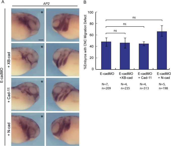 Fig. 4. E-cadherin mediated CNC migration cannot be rescued by other classical cadherins. (A) Embryos were injected with E-cadMO together with XB-cadherin, Cadherin-11 or N-cadherin mRNA, respectively. In situ hybridization using AP2 was performed at stage 25 to analyse CNC migration in vivo. (B) Statistic of the in situ hybridization. N=number of experiments and n=number of embryos. * Indicates injected site and bars show average percentage of embryos with CNC migration defect. At least three independent experiments were performed and the average percentage is shown with standard deviations. Significance is calculated according to fisherâs exact test. Scale bar: 200 μm.