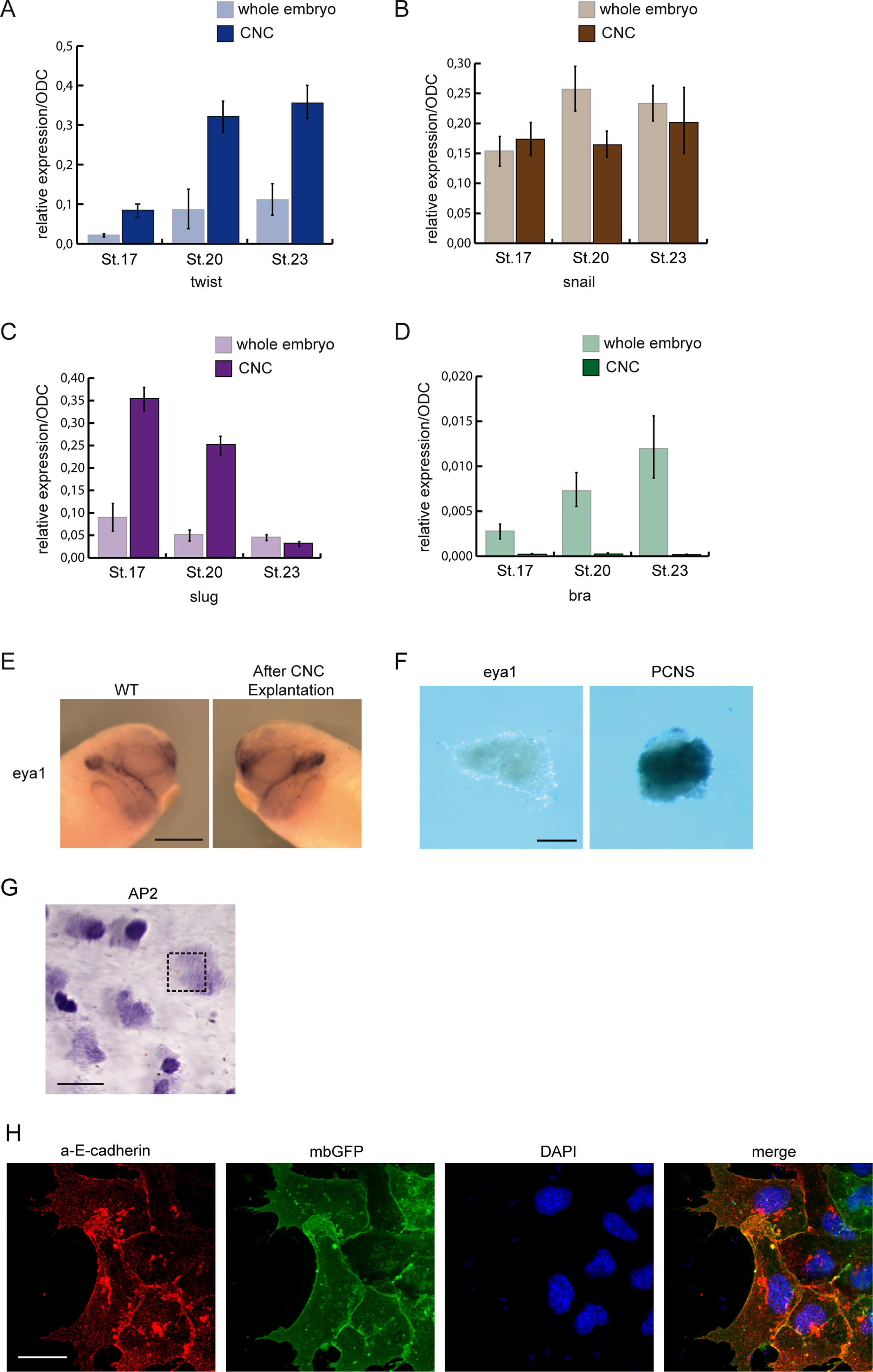 RT-qPCR with different tissue marker genes were used to verify the identity of CNCtissue. CNC explants were dissected at the indicated stages. All values were normalized and calibrated to ODC expression (expression of ODC gene = 1). The bars indicate mean value with standard deviation of at least three independent experiments. CNC specific marker gene (A) twist, (B) snail and (C) slug were present in high abundance in CNC samples throughout all three stages. In the same amount of assessed RNA, the expression of twist as well as that of slug is strongly enriched in CNC sample than in whole embryo sample, whereas the expression of snail did not show this kind of enrichment. (D) The expression levels of the mesoderm marker bra in the CNC samples are barely detectable. (E) In situ hybridization (ISH) for eya1 indicates that placodal tissue is not disturbed when CNC was removed. Scale bar: 200 μm. (F) ISH for eya1 and PCNS on dissected CNC display that the explanted CNC are not contaminated with placodes. Scale bar: 100 μm. (G) ISH for AP2 on several different CNC explants. Scale bar: 200 μm. (H) Immunofluorescence staining of endogenous E-cadherin on CNC explants shown and indicated by the square in (G). CNC cells were labelled with membrane GFP (mbGFP) and explanted on a fibronectin-coated surface. DAPI staining was used to visualize cell nuclei. E-cadherin is prominently localized at cell-cell contacts. Scale bar: 20 μm.