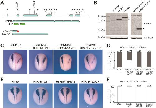 Fig. 6. Loss of Sox10 expression in Sf3b4-depleted embryos is rescued by human SF3B4. (A) Distribution of the 18 unique mutations in SF3B4 gene (*) that cause Nager syndrome (Bernier et al., 2012). Using site directed mutagenesis we generated two constructs that duplicate the human frameshift mutation in exon 2 (c.88delT) and a nonsense mutation in exon3 (c.625C>T). Domain structure of SF3B4/SAP49 (blue boxes) is indicated with the position of the RRMs (green boxes). The predicted translational effect of the two SF3B4 mutations used in this study is shown. The red bar indicates altered amino acid sequence. Modified from Bernier et al., 2012. (B) Western blot using lysate from embryos injected with 2 ng of Xsf3b4, HSF3B4, 88delT or 625C>T mRNAs. α-tubulin is shown as a loading control. 88delT mRNA is expected to generate a short product (~4.0 kDa) not recognized by Sf3b4 antibody. (C) Wild-type (WT) HSF3B4 restore sox10 expression in Sf3b4-depleted embryos, while the mutated mRNAs are unable to do so. Dorsal views, anterior to top. The injected side (right) is indicated by the lineage tracer (Red-Gal). (D) The graph is a quantification of the results from four independent experiments. The number of embryos analyzed (n) is indicated on the top of each bar. (E) Injections of Xsf3b4, HSF3B4 mRNAs and its mutated versions had no effect on sox10 expression. Dorsal views, anterior to top. The injected side (right) is indicated by the lineage tracer (Red-Gal). (F) The graph is a quantification of the results. The number of embryos analyzed (n) is indicated on the top of each bar.