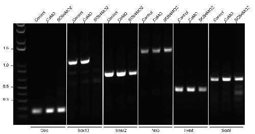 Supplementary Fig S1: RT-PCR analysis of the pre-mRNA processing of Sox10, Snail2, Twist, Sox9 and Pax3 in control, CoMO- and Sf3b4MO2-injected embryos. Embryos were injected bilaterally at the 2-cell stage with 10ng of CoMO or Sf3b4MO2. Embryos were collected at stage 15 and analyzed by RT-PCR using primers designed to amplify the coding region of each gene. With the exception of Sox10 for which the normal transcripts are absent, there was no increase in transcripts size for any of the genes analyzed.