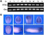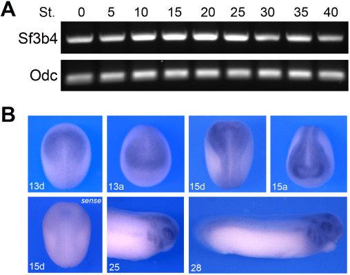 Fig. 2. Developmental expression of sf3b4. (A) RT-PCR analysis of sf3b4 developmental expression. The embryonic stages (St.) are according to Nieuwkoop and Faber (1967). Ornithine decarboxylase (odc) is shown as a loading control. (B) By whole-mount in situ hybridization sf3b4 is enriched dorsally at neurula stage (stage 13 and 15). At tailbud stage (stage 25 and 28) sf3b4 is detected in the branchial arches and the developing eyes. Dorsal views (d), anterior to top. Anterior views (a), dorsal to top. Lateral view, anterior to right, dorsal to top (stage 25 and 28).