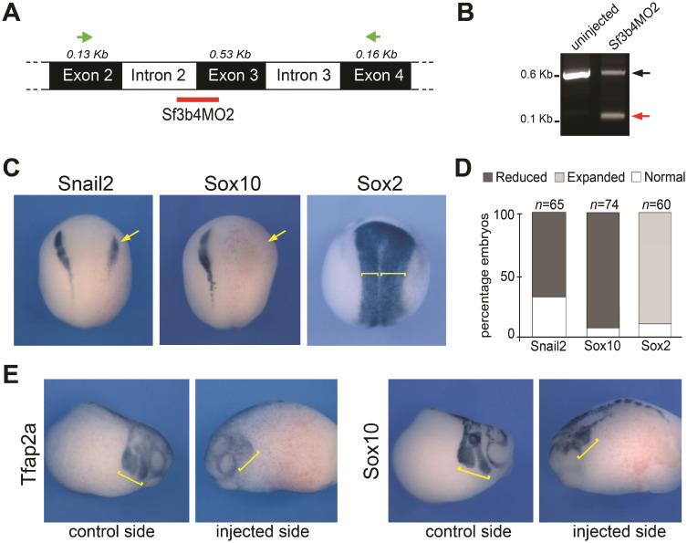 Fig. 4. Sf3b4MO2, a splice blocking morpholino interferes with neural crest formation. (A) The PCR primers to analyze sf3b4 pre-mRNA splicing are indicated (green arrows). The splice blocking morpholino (Sf3b4MO2) targets intron2/exon3 junction (red bar). (B) In Sf3b4MO2-injected embryos a shorter Sf3b4 transcript is detected (red arrow) due to loss of exon 3. (C) At neurula stage the expression of snail2 and sox10 is reduced (arrows) in Sf3b4MO2-injected embryos (30 ng), while sox2 expression is broadened (brackets). Dorsal views, anterior to top. The injected side (right) is indicated by the lineage tracer (Red-Gal). (D) The graph is a quantification of the results from four independent experiments. The number of embryos analyzed (n) is indicated on the top of each bar. (E) At tailbud stage tfap2a and sox10 expression is reduced in the pharyngeal arches (brackets). Lateral views.