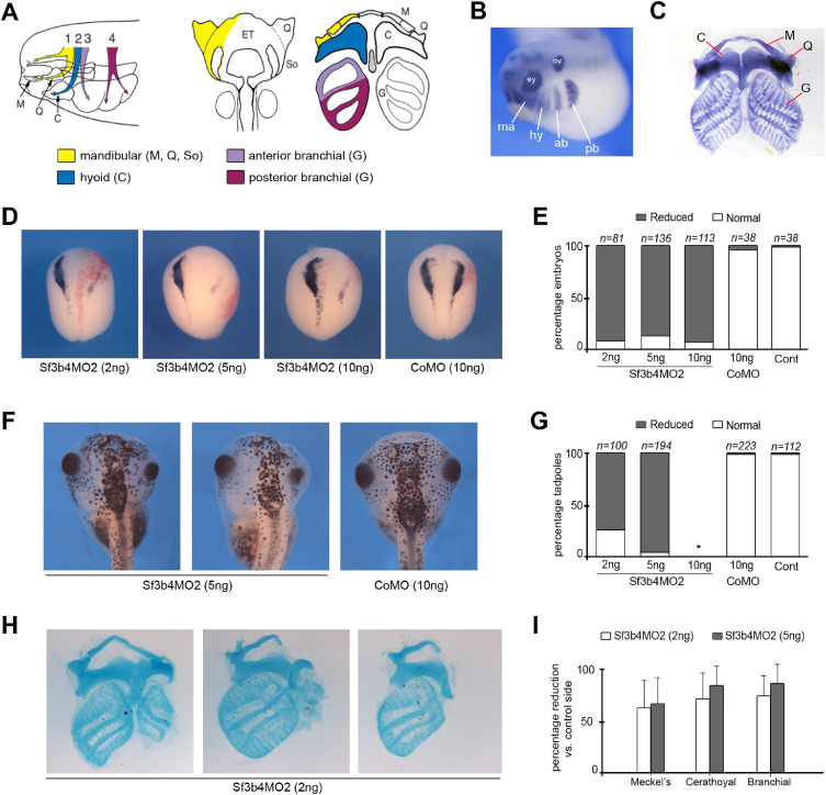 Fig. 7. Long-term consequences of Sf3b4 depletion on craniofacial structures formation. (A) Migration and contribution of the neural crest to cranial skeletal elements. The mandibular neural crest segment (1; yellow) contributes to Meckelâs (M), palatoquadrate (Q), and subocular (So) cartilages; the hyoid neural crest segment (2; blue) contributes to the ceratohyal (C) cartilages; the anterior (3; purple) and posterior (4; red) branchial neural crest segments contribute to the cartilages of the gills (G). Modified from Sadaghiani and Thiebaud, 1987 and Baltzinger et al., 2005. (B) By in situ hybridization sox9 is detected in the four streams of neural crest cells migrating towards the pharyngeal arches, the mandibular (ma), hyoid (hy), anterior branchial (ab) and posterior branchial (pb) segments. Lateral view, anterior to left. ey: eye; ov: otic vesicle. Modified from Lee and Saint-Jeannet, 2011. (C) Alcian blue-stained craniofacial skeletal elements from a stage 45 tadpole. Modified from OâDonnell et al., 2006. (D) At neurula stage the expression of sox10 is reduced in Sf3b4MO2-injected embryos. Dorsal views, anterior to top. The injected side (right) is indicated by the lineage tracer (Red-Gal). (E) The graph is a quantification of the results from seven independent experiments. The number of embryos analyzed (n) is indicated on the top of each bar. (F) Gross morphology of Sf3b4MO2 (5 ng) and CoMO (10 ng)-injected tadpoles. Dorsal views, anterior to top. (G) The graph is a quantification of the results from four independent experiments. The number of tadpoles analyzed (n) is indicated on the top of each bar. (*) Embryos injected with 10 ng Sf3b4MO2 did not survive to the tadpole stage. (H) Examples of flat-mounts of Alcian blue-stained skeletal elements from stage 45 tadpoles injected with Sf3b4MO2 (2 ng). Similar phenotypes were observed with 5 ng Sf3b4MO2. Injected side is on the right. (I) The graph is a quantification of the results from three independent experiments. The size of Meckelâs, ceratohyal and branchial cartilages of affected tadpoles was measured and compared to the same cartilage on the contralateral side to define the percentage reduction. Error bars indicate mean ± s.e.m. Sf3b4MO2 (2 ng), n=69 and Sf3b4MO2 (5 ng), n=38.