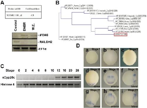 Fig. 1. Induction of xCyp26c by blocking BMP in animal cap explants and the expression pattern of xCyp26c in whole embryos. (A) Selection of the ‘Xl.1946.1.A1_at’ gene induced by DNBR in a cDNA microarray. The expression of ‘Xl.1946.1.A1_at’ was confirmed by RT-PCR. (B) Phylogenetic relationships among the xCYP26 proteins. (C) Developmental expression of xCyp26c. RT-PCR analysis was performed at various stages, as indicated (Nieuwkoop and Faber, 1956). Histone 4 or EF1α serve as an RNA loading control. (D) Spatial expression patterns of xCyp26c. Whole-mount in situ hybridization analysis of xCyp26c was performed during oocyte to tail bud stages. Views of whole embryos at the stages are indicated on top of each column. xCyp26c was expressed in the presumptive anterior neural ectoderm, and the expression continued to the tail bud stage.