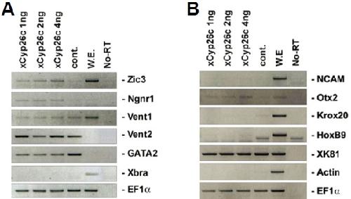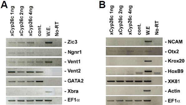 Fig. 2. Induction of neural genes by overexpression of xCyp26c in animal cap explants. Xenopus embryos at the one cell stage or two-cell stage were injected in the animal pole with xCyp26c mRNA. Animal caps were dissected from the injected embryos at stages 8–9 and cultured to stage 12 (A) or 24 (B). RT-PCR was then performed to detect expression of the indicated genes. EF1α serves as a RNA loading control.