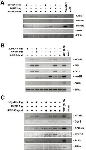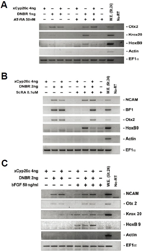 Fig. 3. Inhibition of all-trans and 9-cis retinoic acid-induced posteriorization by overexpression of xCyp26c in animal cap explants. xCyp26c was injected with DNBR, and animal caps were treated with all-trans retinoic acid (AT-RA) (A), 9-cis retinoic acid (9cRA) (B), and basic FGF (bFGF) (C) at stage 8 and then cultured to stage 24. The expression pattern of marker genes were analyzed by RT-PCR.