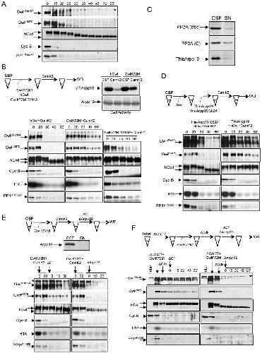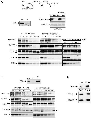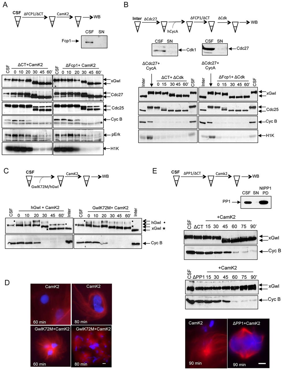PP2A-B55 and PP1, but not Fcp1, are required for correct meiotic exit. (A) CSF extracts were first used for immunodepletion with control (ΔCT) or anti-Fcp1 antibodies (ΔFcp1), and subsequently forced to exit meiosis by CamK2 addition. Immunodepletion efficacy of Fcp1 antibodies is shown by western blotting (WB) of CSF extracts and supernatants (SN). Dephosphorylation of endogenous Gwl (xGwl), Cdc27 and Cdc25 was determined by western blotting at the indicated times after CamK2 addition by changes in the mobility shift of these proteins (unphosphorylated proteins migrate more quickly). Phosphorylation of MAPK (also known as Mapk1) was checked by using anti-phospho-Erk antibodies (pErk). Cyclin B (Cyc B) degradation and cyclin-B–Cdk1 activity (H1K) are also shown. (B) Interphase extracts were immunodepleted of Cdc27, and mitotic entry was then induced by the addition of human cyclin A (30 nM final concentration). After 40 min, a sample of this extract was recovered to check substrate phosphorylation (ΔCdc27+CycA). Extracts were then first depleted with control antibody or an anti-Fcp1 antibody, and subsequently depleted of Cdks (ΔCdk) activity by immunodepletion. Samples were recovered at the indicated timepoints, and the phosphorylation of endogenous Gwl (xGwl) and Cdc25, as well as the levels of cyclin B and the activity of cyclin-B–Cdk1, were examined. Efficacy of immunodepletion with antibodies against Cdc27 and Cdk1 is shown. (C) CSF extracts were supplemented with the wild-type (hGwl) or the K72M mutant form of human Gwl (GwlK72M) (0.1 µg in 10 µl of CSF extracts), and mitotic exit was then promoted by CamK2 addition. The levels of phosphorylation of endogenous (xGwl) and ectopic (hGwl) Gwl proteins, and the stability of cyclin B, were assessed by western blot. The amount of endogenous cyclin B and xGwl from 1 µl of an interphase egg extract prepared 40 min after ionophore addition in shown. (D) Sperm nuclei and tubulin–Rhodamine were added to CSF extracts that had been supplemented or not with GwlK72M. After 60 min, a constitutive form of CamK2 was added to promote CSF exit. After fixation of the samples (60 and 80 min after CamK2 addition) with 1% formaldehyde containing DAPI (1 µg/ml), a 1 µl sample was used to visualise chromatin condensation and spindle formation with light microscopy. Scale bar: 15 µm. (E) CSF extracts were depleted (ΔPP1) or not of PP1 and supplemented with CamK2 in order to induce mitotic exit. Samples were removed at the indicated times, and Gwl phosphorylation and cyclin B degradation were monitored by western blotting. PP1 or control depletions were obtained by using a pulldown approach in CSF extracts that had been supplemented with a control His6-tagged protein or a His6-tagged protein containing the PP1-binding site of NIPP1 (NIPP1 PD). Efficacy of PP1 depletion is shown. Spindle formation and chromatin condensation in PP1-devoid extracts were observed by microscopy, as indicated in D, except that control depletion or depletion of PP1 instead of GwlK72M addition was performed. Scale bars: 10 µm. Inter, interphase egg extracts.
