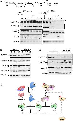 PP1 and PP2A-B55 both dephosphorylate Gwl on Thr194 and Ser875 in vitro. (A) Interphase extracts were depleted of Cdc27, supplemented with GwlK72M, depleted of PP1 (ΔPP1) and Cdks (ΔCdks) by immunoprecipitation, and finally depleted (or not) of Arpp19. Phosphorylation of Ser875 and Thr194 of Gwl, as well as ectopic Gwl levels (hGwl), the stability of cyclin B (cyc B) and cyclin-B–Cdk1 activity (H1K) are shown. Asterisks denote non-specific bands recognised by the antibodies. (B) Phosphorylated hGwl and active PP2A were obtained by GST pull down and immunoprecipitation from CSF and interphase extracts, respectively, and incubated together with or without ThioArpp19 at room temperature for a dephosphorylation assay. Samples were recovered at the indicated times (min) and monitored for phosphorylation of Gwl on Ser875 and Thr194. Protein levels of Gwl and the PP2A A [PP2A(A)] and C [PP2A(C)] subunits were also assessed. (C) A dephosphorylation assay was performed as described in B, except that active PP1 was obtained by His pull down from interphase extracts that had been supplemented with ectopic His6–PP1 and the NIPP1 inhibitor instead of ThioArpp19. (D) Working model showing the mechanisms by which cyclin B degradation promotes Gwl inactivation and mitotic exit. Full arrows represents active pathway in mitotic exit; dashed arrows represent inactive pathways in mitotic exit. ‘A’, PP2A subunit A; B55, B55 subunit of PP2A; ‘C’, PP2A subunit C; P, phosphate group.
