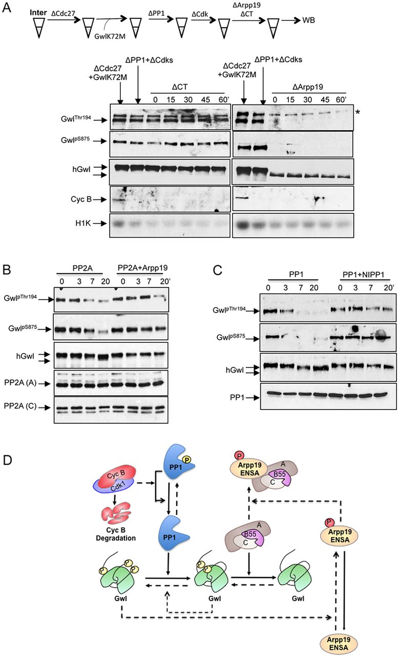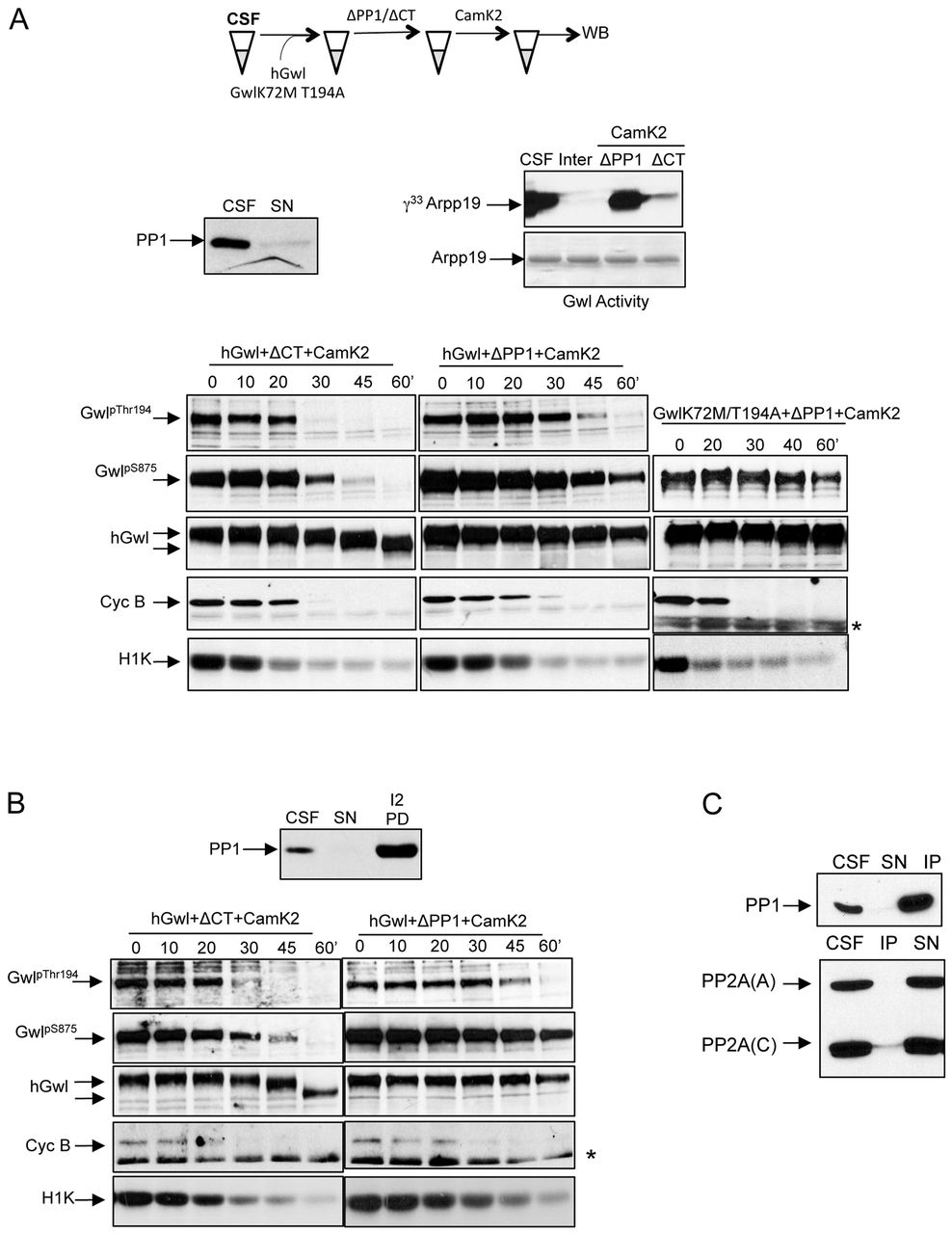 Preventing PP2A-B55 reactivation upon meiotic and mitotic exit promotes a substantial delay of the phosphorylation of Gwl on Thr194. (A) 20 µl of CSF extracts were supplemented with wild-type Gwl recombinant kinase (hGwl; 1 µg). After 20 min, extracts were supplemented with CamK2, and samples were recovered at the indicated timepoints to study the dephosphorylation of Gwl on Ser875 (GwlpSer875) and Thr194 (GwlpThr194) with phospho-specific antibodies. Cyclin B (cyc B) stability, phosphorylation of PP1 on Thr320 (PP1pThr320) and levels of the ectopic human Gwl forms (hGwl) are also shown. (B) 20 µl of CSF extracts were supplemented with either wild-type (hGwl) or GwlK72M recombinant proteins (1 µg), or with 5 µl of CSF extracts in which the mRNA of the GwlK72M T194A double mutant had been translated. After CamK2 addition, samples were taken to check dephosphorylation of Gwl on Ser875 and Thr194, cyclin B stability, cyclin-B–Cdk1 activity, phosphorylation of PP1 on Thr320 and the levels of the ectopic human Gwl. The activity of ectopic human Gwl (γ33Arpp19) was measured as indicated in Materials and Methods in CSF extracts that had been supplemented with hGwl or GwlK72M 60 min after CamK2 addition. (C) 2 µg of Thio-phosphorylated His–Arpp19 was added to 20 µl of CSF extracts and, after 20 min of incubation, ThioArpp19 was recovered by His-tag pull down. The levels of Arpp19 (ThioArpp19) and the PP2A B55 [PP2A (B55)] and C [PP2A(C)] subunits left in the supernatant were assessed by western blotting (WB). SN, supernatant. (D) The experiment described in A except that Thio-phosphorylated His–Arpp19 (2 μg for 20 μl of CSF extracts) instead of GwlK72M was added. (E) CSF extracts were supplemented with GwlK72M and CamK2, and submitted to a control depletion (ΔCT) or depletion of Arpp19 (ΔArpp19). Phosphorylation of the indicated residues of Gwl was analysed, as well as the ectopic Gwl levels, cyclin B degradation and cyclin-B–Cdk1 activity (H1K). Efficacy of Arpp19 depletion is shown. (F) Interphase extracts were devoid of Cdc27 (ΔCdc17; by immunodepletion) and induced to enter into mitosis by GwlK72M addition. After 40 min, extracts were first forced to exit mitosis by Cdk1 depletion and were subsequently depleted of Arpp19 (or not) by immunoprecipitation. Phosphorylation on Ser875 and Thr194 of Gwl, and on Thr320 of PP1, as well as ectopic GwlK72M and cyclin B levels and cyclin-B–Cdk1 activity are shown. Asterisks denote non-specific bands recognised by the antibodies. Inter, interphase.