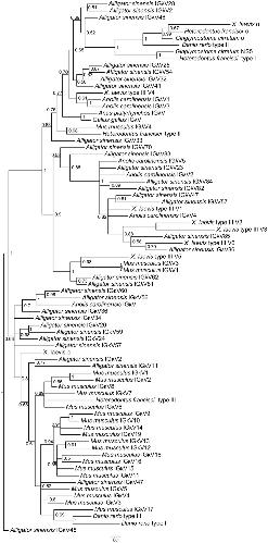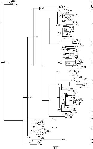 Fig 3. Phylogenetic tree analysis of the 86 Alligator sinensis Vλ genes.A phylogenetic tree of the nucleotides of 86 Alligator sinensis Vλ segments was constructed. The 19 Vλ gene families are labeled with numbers on the right. Phylogenetic trees were constructed using MrBayes3.1.2 [58] and viewed in TREEVIEW [59].