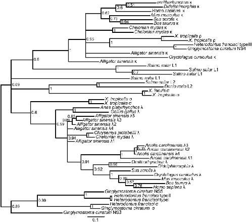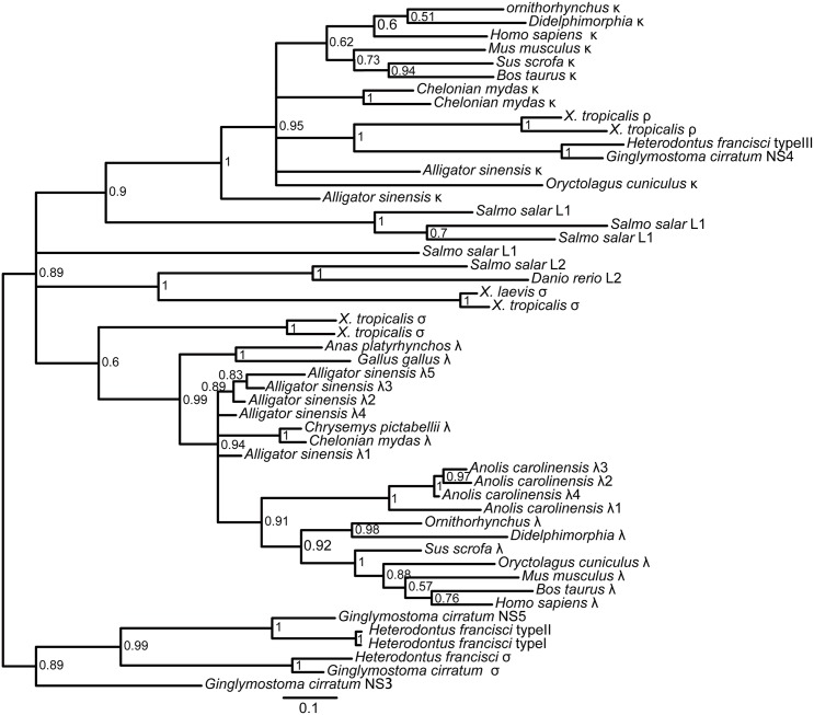 Fig 5. Phylogenetic analysis of the IgL chain C genes in jawed vertebrates.The phylogenetic tree was constructed using C domains. The scale shown as a bar represents the genetic distance (number of nucleotide changes at the given scale). The credibility value for each node is shown. Phylogenetic trees were constructed using MrBayes3.1.2 [58] and viewed in TREEVIEW [59].
