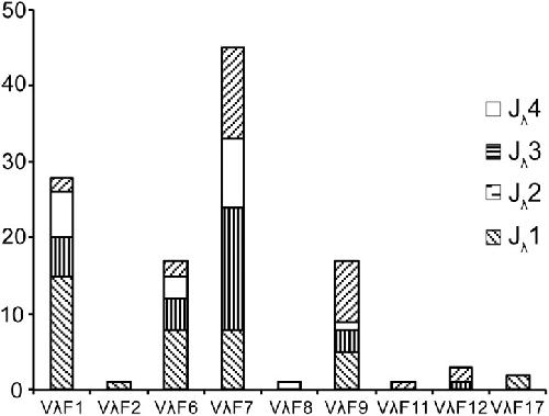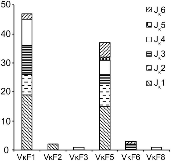 Fig 10. Usage frequency of Vκ and Jκ genes in the Alligator sinensis.The number behind the Vκ indicates the number of families.