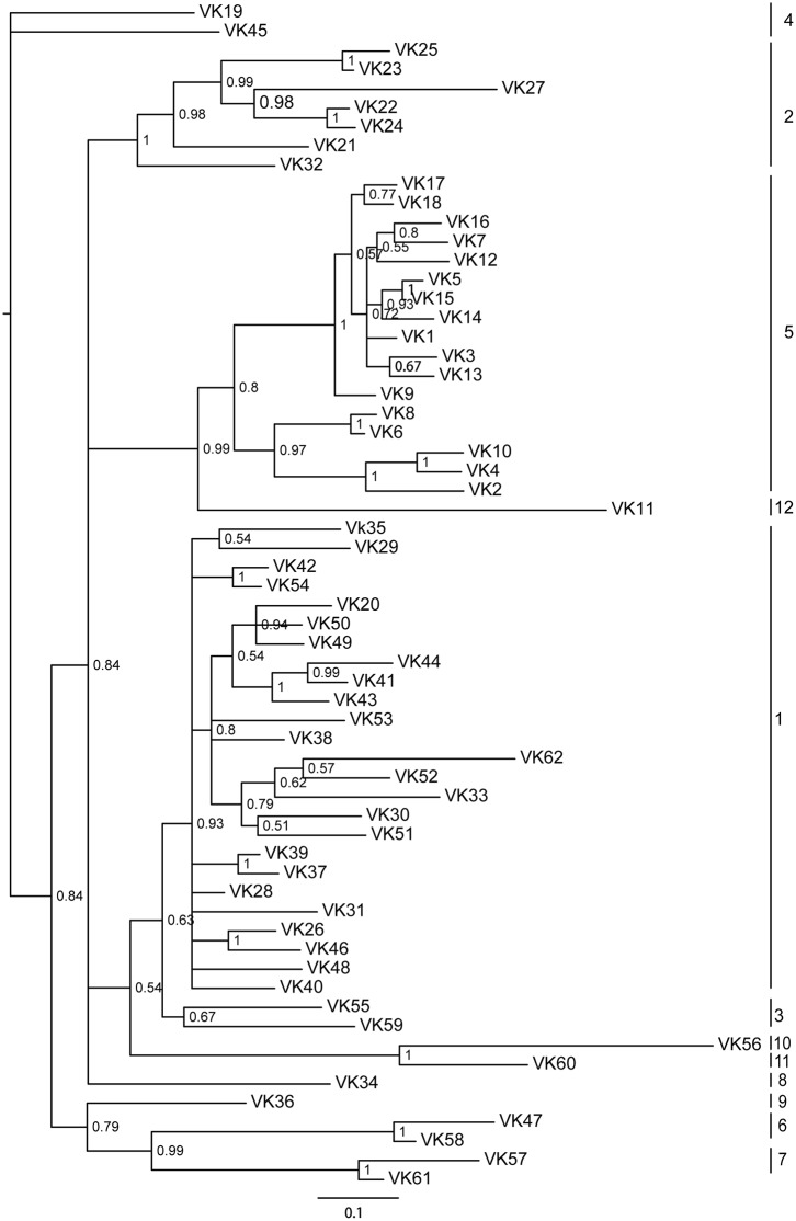 Fig 4. Phylogenetic tree analysis of the 62 Alligator sinensis Vκ genes.A phylogenetic tree of the nucleotides of the Alligator sinensis Vκ segments was constructed. The 12 Vκ gene families are labeled with numbers on the right. Phylogenetic trees were constructed using MrBayes3.1.2 [58] and viewed in TREEVIEW [59].