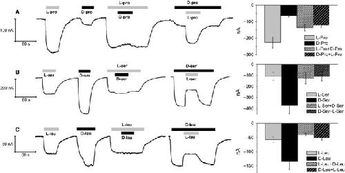 Figure 1. Transport current in the presence of D‐ and L‐ amino acids. Single oocytes (left) and mean values ± SEM for several (n = from 5 to 25) oocytes (right). Relative efficiency of L‐ versus D‐ proline 3 mmol/L (A), serine 3 mmol/L (B), and leucine 0.5 mmol/L (C) in eliciting transport‐associated current by KAAT1 when Na+ is the driving ion. In the case of proline, the D‐ enantiomer is less potent than the L‐form, whereas the opposite occurs for leucine and serine. In all cases, the L‐form is dominant over the D‐form used at the same concentration: the current amplitude upon simultaneous perfusion of both enantiomers is always close to the level generated by the L‐form alone. Currents were recorded as described in Material and Methods. |