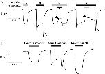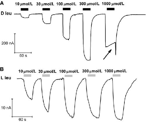 Figure 2. Leucine dose‐response in Na+. (A) the transport currents elicited by increasing amounts of D‐leucine show a progressive growth up to 300 μmol/L, but a further increase to 1 mmol/L produces an abrupt change in behavior exhibiting a reduction of the maximum attained value, an inactivation process and a peculiar inward transient surge at washout (arrow). (B) the same amounts of L‐leucine induce progressively larger responses showing saturation above 100 μmol/L without any anomalous behavior. |