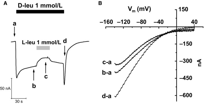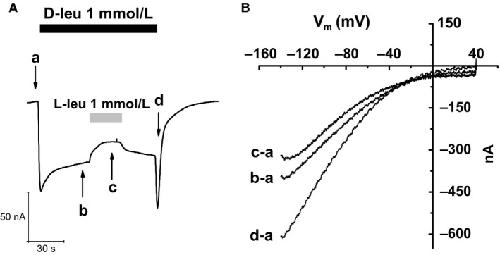 Figure 5. Current–voltage relationship for the different conditions of recording in a representative oocyte. (A) fast voltage ramps (from −140 to +40 mV, duration 1 sec) before the application of substrates (a), in the presence of 1 mmol/L D‐leucine (b), of both D‐ and L‐leucine 1 mmol/L each (c), and upon D‐leucine washout (d). (B) I–V relationships obtained by subtracting the control current (a) from each of the others. |