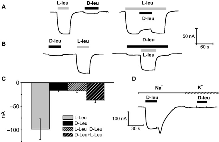Figure 6. D‐leucine in high K+ solution. When applied at 500 μmol/L in a K+‐containing external solution, D‐leucine elicits a small current compared to L‐leucine. The addition of D‐ to L‐leucine (both at 500 μmol/L) slightly inhibits the L‐leucine‐induced current (A). The increase in L‐leucine current when applied in addition to D‐leucine (both at 500 μmol/L), does not reach the level elicited by L‐leucine alone (B). The mean values ± SEM for several (n = from 6 to 15 from at least 3 different batches) oocytes are reported (C).Comparison of the currents generated by 1 mmol/L D‐leucine in presence of high external Na+ or high external K+ revealed that, in the latter condition, only a very small transport current is detected (D). |