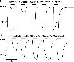 Figure 9. Currents elicited by L‐ and D‐amino acid in KAAT1 S308T. While the currents generated by serine 3 mmol/L, and their relative potency, are not affected by the mutation, a selective reduction of the current of the L‐form is seen for proline 3 mmol/L. As expected, no current is generated by L‐leucine 1 mmol/L, whereas the same concentration of D‐leucine is effective in producing a response that includes a weaker but reproducible inward current surge at wash out (arrow). |
