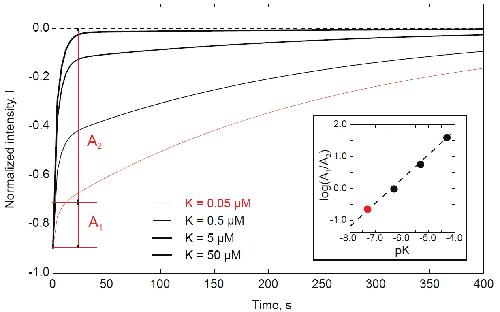 Figure S13. FRAP kinetics with different dissociation constants formed by numerical solution of the system of equations (S1.5). Parameter values were set as following: ko f f = 1=250sô1; l = 7:5mm; b(0) = a(0) = 1mM; D = 1mm2=s; initially bleached protein was distributed normally with dispersion equal to a half of the reactor length l. The step of the coordinate grid was l/100; integration step was 2 10ô4 s. Every numerical curve was fitted to the two-exponential equation and the ratio of pre-exponential factors A1;2 (S1.11) is shown against the dissociation constant in double-logarithmic coordinates (insert). |