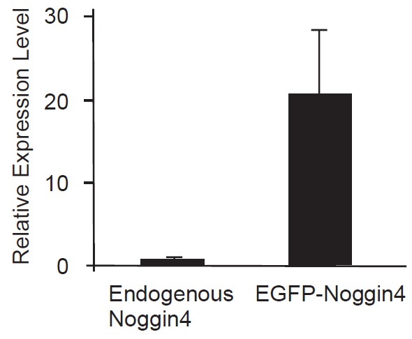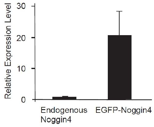 Figure S16. Relative concentrations of the endogenous Noggin4 and EGFP-Noggin4 mRNAs in the ectodermal explants of the midgastrula stage embryos. 70 pg of EGFP-Noggin4 mRNA was injected into the animal pole cytoplasm of each dorsal blastomere of 4-cell stage embryos. The dorsal ectoderm explants were excised and collected from injected and wild-type, non-injected, sibling embryos at stage 11, followed by RNA extraction. qRT-PCR with primers for Noggin4 and EGFP was performed for samples obtained from non-injected and injected embryos, respectively. The data were normalised relative to expression of two housekeeping genes, ODC and EF1a as described in.5 The expression level of the endogenous Noggin4 in the wild-type samples was used for normalisation and regarded as one unit. |