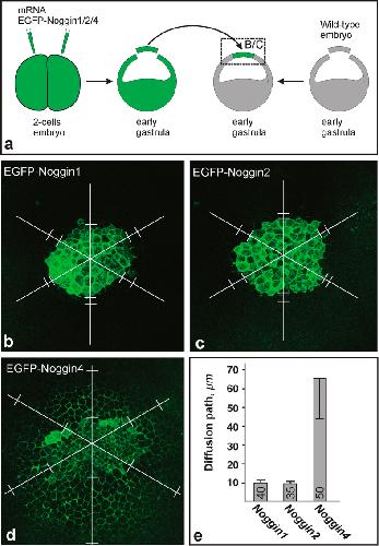 Figure 3. Diffusion of EGFP-Noggin1/2/4 from the ectodermal grafts.(a) Experimental design. The region that corresponds to images (bâd) is framed by a dashed rectangle. (bâd) Representative examples of the grafts 1 hour after transplantation. Note that in contrast to recipient embryo cells, graft cells contain EGFP-Noggin1/2/4 in the cytoplasm. To compare the diffusibility of the EGFP-Noggin1/24, the diffusion path (DP) was measured for each graft in six directions (white lines radiated under 60 degrees from the approximate centre of the graft), beginning from the graft border until the point at which the EGFP fluorescence level in an IS became equal to the background fluorescence level in the donor IS (pairs of white bars perpendicular to the radial lies). (e) Medium DP and deviation calculated for all grafts per type (number of grafts is indicated within each column). |