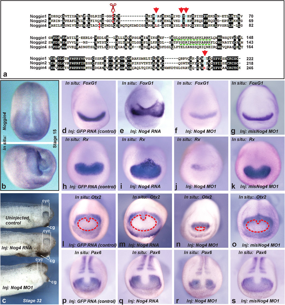 Figure 1. Properties of Noggin4.(a) Alignment of Xenopus laevis Noggins. Positions essential for Noggin1 binding to BMP1 are indicated by red arrows. HSPG binding motifs and cleavage sites are indicated by green and red dashed lines, respectively. (b) Whole-mount in situ hybridization of a midneurula embryo with dig-probe to Noggin4 mRNA. Dorsal view at the top, the right-frontal view at the bottom. (c) Effects of Noggin4 mRNA (80%, nâ=â120) and MO1 (85%, nâ=â130) injections on the development of head structures. Cg-cement gland. (dâs) In situ hybridization with dig-probes to FoxG1, Rx, Otx2 and Pax6 mRNA of midneurula embryos injected with GFP mRNA (control) (0%, nâ=â40; 0%, nâ=â50; 0%, nâ=â40; 0%, nâ=â30, abnormal phenotypes respectively), Noggin4 mRNA (85%, nâ=â30; 61%, nâ=â35; 81%, nâ=â40; 65%, nâ=â40 abnormal phenotypes respectively), Noggin4 MO1 (90%, nâ=â50; 86%, nâ=â40; 60%, nâ=â40; 60%, nâ=â40, abnormal phenotypes respectively) and misNoggin4 MO1 (control) (0%, nâ=â30; 0%, nâ=â30; 0%, nâ=â40; 0%, nâ=â30, abnormal phenotypes respectively). Red dashed line surrounds the presumptive rostral forebrain territory. Anterior view, dorsal to the top. |