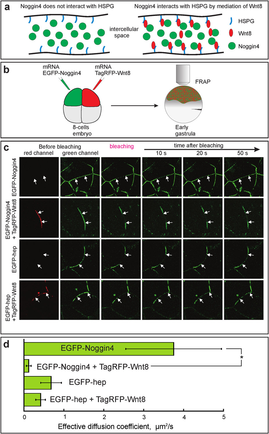 Figure 6: Investigation of Noggin4 interaction with Wnt8 in living embryos via FRAP assay. (a) The cartoon explains how free diffusion of Noggin4 is retarded by its interaction with Wnt8 adsorbed on HSPG. (b) Schema for obtaining embryos that express EGFP-Noggin4 and TagRFP-Wnt8 in different cells. (c) Representative examples of FRAP in the intracellular space of animal ectoderm in embryos injected, as shown in B, with mRNAs of indicated fluorescently labelled proteins. Arrows mark the borders of the bleached region. (d) Mean values of the effective diffusion coefficients of EGFP-Noggin4 and EGFP-hep measured experimentally and shown in (aâc). Five to 7 series of experiments (10 to 20 individual measurements per experiment) were conducted for each of the four types of injections. Averaged FRAP curves are presented at Fig. S15. |