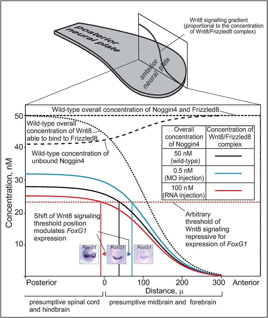 Figure 7: Mathematical modelling of the Noggin4 influence on the anterior-posterior Wnt8 signalling gradient. During neurulation, Wnt8 diffusing from the posterior regions within the anterior neural plate and interacting there with Frizzled8 forms a gradient of Wnt8 signalling, which is schematically presented by a solid black line within the rectangle standing along the neural plate midline on the schema shown above. Coloured curves within an enlarged version of this rectangle (below) demonstrate the theoretically calculated spatial distribution of the Wnt8/Frizzled8 complex (i.e., Frizzled8 receptor activated by Wnt8 binding) at three concentrations of Noggin4 (wild-type, decreased by Noggin4 MO injections and incresased by Noggin4 mRNA injections) indicated in the inserted table. Three inserted photos illustrate the assumed effects of the corresponding spatial shifts of the Wnt8/Frizzled8 complex arbitrary threshold concentration on the forebrain marker FoxG1 expression. See main text, Supplementary Materials and Methods 4.2 and Fig. 1 for details. |