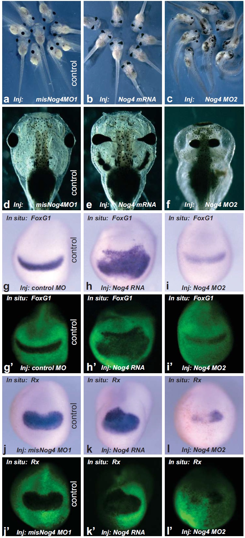 Figure S3. Effects of Noggin4 mRNA and MO2 injections on tadpole head structures and expression of anterior markers, FoxG1 and Rx, at the midneurula stage. (aâc) 5 days tadpoles injected as indicated. (dâf) Heads of 5 days tadpoles injected as indicated are shown from the dorsal side, anterior to the top. (g-lâ) In situ hybridisation with dig-probes to FoxG1 and Rx mRNA of midneurula embryos injected with control MO provided by GeneTools (100%, n=30 (g and gâ)), Noggin4 mRNA (85%, n=30 (h and hâ) and 61%, n=35 (k and kâ)), misNoggin4 MO2 (100%, n=40 (i and iâ, l and lâ)), and misNoggin4 MO1 (100%, n=40 (f) and 80%, n=40 (i)). |
