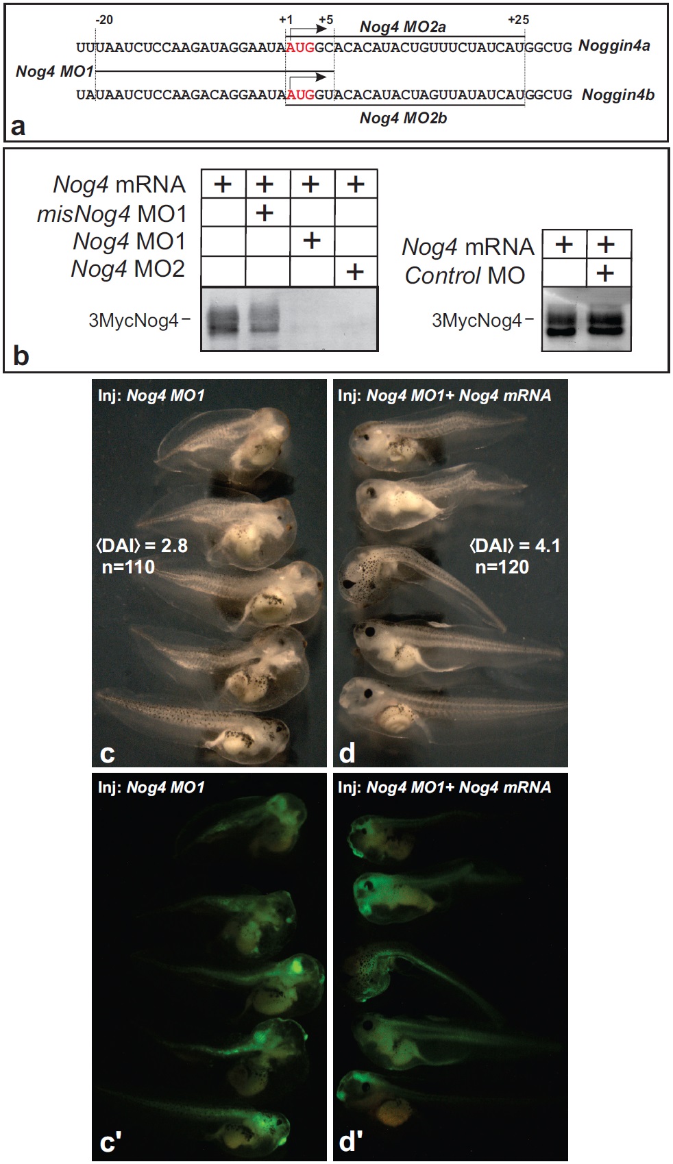Figure S4. Testing of MO specificity and efficiency. (a) Schema of the morpholino target sites location on both pseudoalleles of the Xenopus laevis Noggin4 mRNA. (b) 5â-UTR-Myc-Noggin4 mRNA were injected into each blastomere of 2-cell Xenopus laevis embryos (100 pg/blastomere), either alone or in a mixture with control misNoggin4 MO, MO1, MO2 (8 nl of 0.2 mM water solution) or the standard control MO provided by GeneTools (8 nl of 0.5 mM water solution). The injected embryos were collected at the midgastrula stage and analysed for presence of Myc-Noggin4 by Western blotting with anti-Myc antibody (see Materials and Methods for details). (c-dâ) The specificity of the MO effects was confirmed by rescue experiments, in which Noggin4 MO1 was injected either alone (c and câ) or with Noggin4 mRNA deprived of the MO1 target site (d and dâ). Medial Dorso-Anterior Index (DAI) was calculated for both types of tadpoles developed from the injected embryos. |