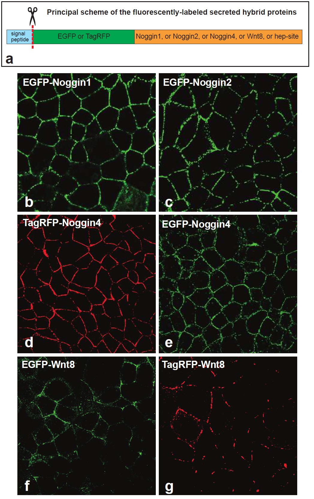 Figure S7. Noggin1, Noggin2, Noggin4 and Wnt8 fused to EGFP or TagRFP are secreted into the intracellular space of animal ectoderm of the Xenopus laevis embryos. (a) Principal scheme of the fluorescently-labeled secreted proteins. (b-g) Visualisation of the indicated fusion proteins in the intercellular space of the animal ectoderm of living Xenopus laevis embryos. Embryos at 4-cell stage were injected into animal blastomeres with mRNAs encoding indicated fusion proteins. At early-midgastruala stage, the injected embryos were photographed from the animal pole using the confocal microscope. |