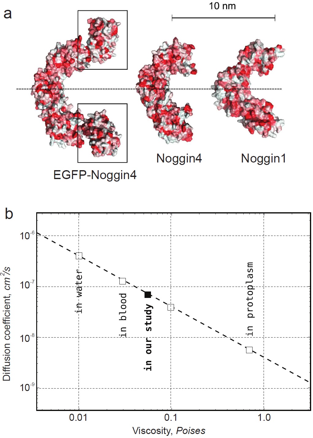Figure S11. Hydrodynamic modelling of Noggins diffusivity. (a) Solvent accessible surfaces of Noggin1, Noggin4 and EGFP-Noggin4 molecules were predicted by homological modelling and molecular dynamic equilibration. C2 symmetry axis (dashed line) passes through the interdimeric connection. Fused EGFP molecules are framed by rectangles. (b) Calculated diffusivity of the Noggin4-EGFP dimer in dependence of solvent viscosity. Viscosity values for water (at 300 K), blood3 and protoplasm4 were selected as calibration points. |