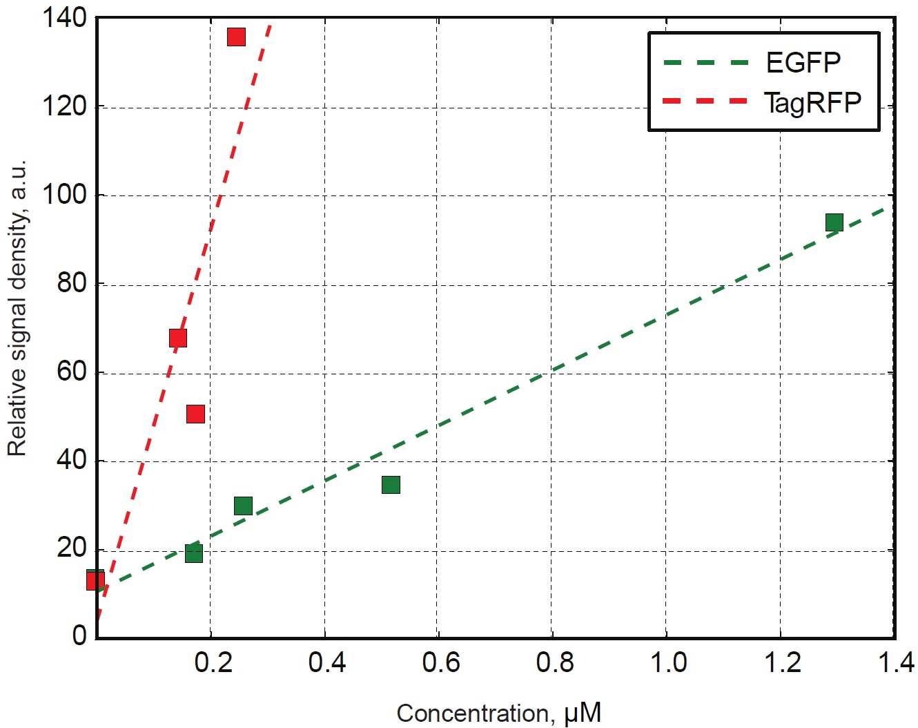 Figure S14. Calibration of the confocal microscope. Calibration curves for EGFP (green) and TagRFP (red) proteins under the most usable microscopy settings. |